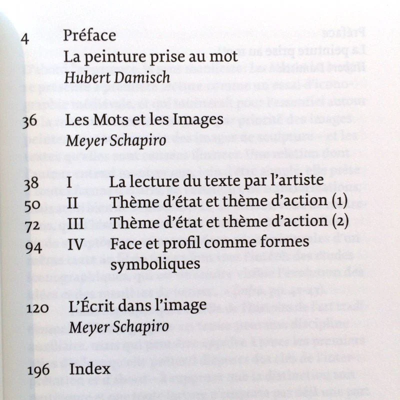 Un second texte, inédit, L’Écrit dans l’image, examine, de l'Antiquité grecque à l'art moderne, l'intrusion paradoxale des mots dans l'œuvre peinte. Mots à l’envers, mots tournés vers Dieu, vers le spectateur, vers le personnage figuré, blocs de texte indépendants de leur cadre livresque, signature en perspective, rouleaux vierges d’inscription pour signifier l’échange verbal – autant d’observations pénétrantes rassemblées par Schapiro au long d’une vie tout entière vouée à la pensée visuelle.